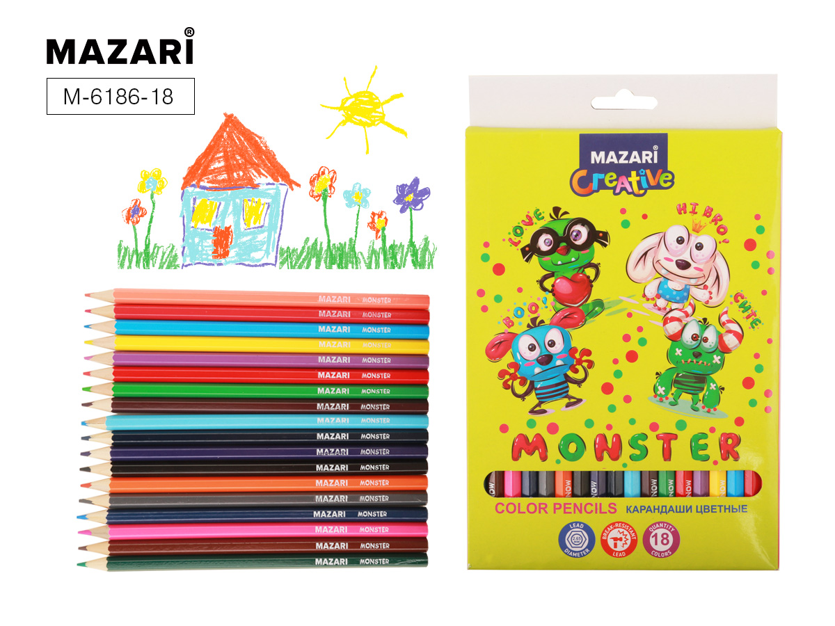 Карандаши цветные MONSTER, 18цв., шестигранный кор d грифеля=2,6 мм 8 шт/уп М-6186-18 Спец Цена !