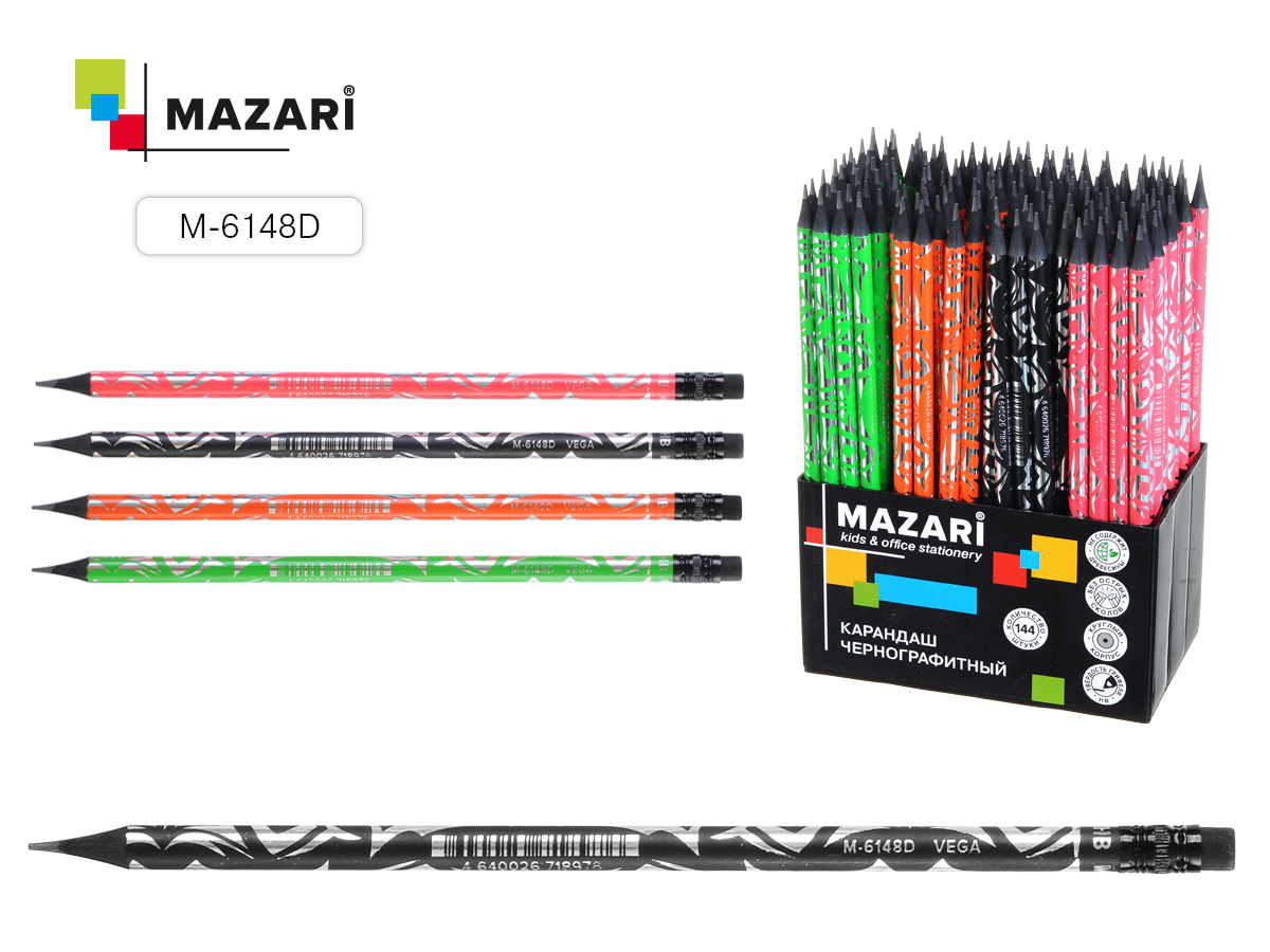 Карандаш чернографитный VEGA (ударопрочный), HB, с ластиком 4 цв 144 шт/уп М-6148D